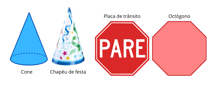 | Objetos com formato de corpos redondos | Objetos com formato de poliedros |