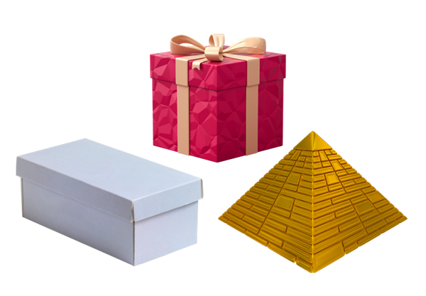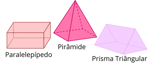 Os corpos não redondos são chamados de poliedros. A palavra Poliedro significa "muitas faces". Logo, chamamos de poliedros os sólidos que têm todas as faces planas. A pirâmide é um exemplo de poliedro. Veja mais alguns exemplos.