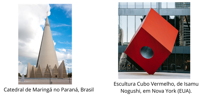 Algumas figuras geométricas não planas são chamadas de sólidos geométricos . As diferentes formas presentes nas obras de arte dão a ideia de sólidos geométricos, como podemos observar nestas fotos: