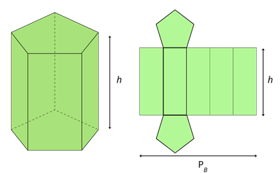 A planificação de um prisma reto é composta de um retângulo e dois polígonos, que formamas bases. Um dos lados do retângulo é o perímetro do polígono da base. O outro lado coincide com a altura do prisma.